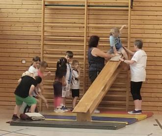In der 3. Woche fand unser „Sportfest“ unter dem Motto „die 4 Jahreszeiten“ statt. Die Turnhalle der Regelschule bot uns hierfür eine große Vielfalt an Sportgeräten. An der Station „Frühling“ konnten die Kinder ihre Geschicklichkeit testen, indem sie über die Wackelbrücke ins Hasenland balancierten. Im „Winter“ wurden aus Sprossenwand und Turnbank eine lustige Rodelbahn. Und wer Lust hatte, konnte mit Teppichen unter den Füßen, schlittschuhlaufend durch die Turnhalle sausen.