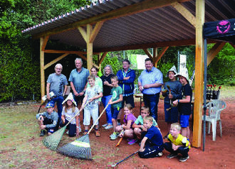 Bauliche Vorbereitungen an der Bogensportanlage im Bad Rodacher Waldbad zu den Ferienspaßwochen 2022 der Jugendpflege Bad Rodach und mit Unterstützung der Initiative Rodachtal-Aktion „5 für 500“. Hier Foto von der Fertigstellung mit Vertreterinnen und Vertretern der Stadt Bad Rodach, der Initiative Rodachtal - und Kindern der Bad Roda- cher Ferienspaßwoche, die eifrig mitgeholfen haben. Foto: J. Forscht