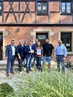 Haus Roth in Tambach - junges Wohnen in historischem Klinkerbau. Bei der Baukulturpreisübergabe am 18. September 2024: V.l.n.r: Herr Marco Ahles, Vorstandsassistent VR-Bank Lichtenfels-Ebern eG / Frau Nina Liebermann, Bürgermeisterin Gemeinde Itzgrund und Projektpatin Leitprojekt „Bauen und Wohnen“ Initiative Rodachtal / Frau Christine Bardin, Arbeitskreis Historische Bausubstanz der Initiative Rodachtal / Herr Martin Finzel, 1. Vorsitzender der Initiative Rodachtal e.V. und Bürgermeister der Gemeinde Ahorn, Herr Dieter Treubig, Beigeordneter der Stadt Heldburg / Preisträgerin Frau Christin Rothaug mit Partner Herr Tom Schelhorn / Herr Hans Steinfelder, Bürgermeister Weitramsdorf / Foto: Initiative Rodachtal