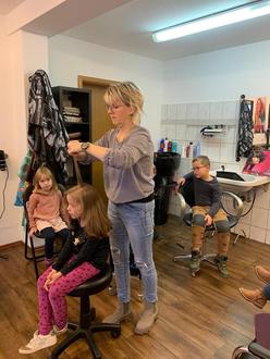 Auch der Friseur im Dorf wurde schon unsicher gemacht, Stefanie Fuchs erklärte den Kindern liebevoll worauf es bei der richtigen Frisur ankommt und manche Kindern wurden sogar gestylt mit dem Lockenstab, auch hierfür ein Dankeschön.