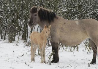 Am 21. / 22. Januar 2023 war es kalt, ein eisiger Nordwind wehte und die Weidetiere der Hutelansdchaft Rodachaue bei Stressenhausen hatten in den Gehölzen des Heubergs Schutz gefunden. Dann aber traten sie aus dem Dickicht: Eine Konik-Stute und ihr wenige Tage altes Fohlen. Beide sind trotz der winterlichen Wetterverhältnisse wohlauf. Wie auch die Heckrinder, vertragen sie das Wetter ohne Probleme und finden ganzjährig ihr Futter.