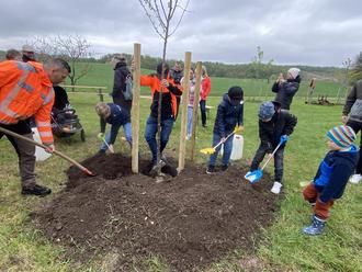 Insgesamt stehen nun bereits 12 Bäume auf dem Areal in der Streufdorfer Flur. Nach und nach entsteht dort eine Streuobstwiese mit einheimischen Obstgehölzen, auf der Eltern und Kinder schon bald die ersten eigenen Früchte ernten können.