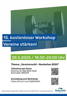 Rodachtal, den 24. April 2025 - am Mittwoch, dem 28. Mai 2025 veranstaltet die Initiative Rodachtal von 18:30 bis 20:00 Uhr ihren 15. Workshop aus der Reihe „Vereine stärken“. Das Thema des kostenlosen Online-Vortrags für Vereinsmitglieder lautet "Vereinsrecht“.