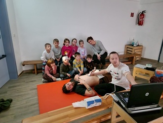 Außerdem hatten die Vorschulkinder Besuch von der Gemeinschaftspraxis. Dr. Langenhahn und Nancy Mai brachten eine große Kiste Obst und Gemüse mit. Gemeinsam mit den Vorschülern wurde die gesunde Ernährung besprochen und jedes Kind konnte ein Teil zur Ernährungspyramide beitragen. Das war aber noch nicht alles, was muss man eigentlich im Notfall beachten? Wie versorgt man eine Wunde? Warum wird Blut abgenommen? All diese Fragen konnten geklärt werden. Das absolute Highlight war das mitgebrachte Ultraschallgerät, damit konnten dann auch die letzten bestehenden Fragen noch geklärt werden. Wie sieht es im inneren eines Menschen aus? Ein großes Dankeschön geht an dieser Stelle an die Gemeinschaftspraxis, die sich die Zeit genommen hat und unseren Vorschulkindern einen so schönen und informativen Vormittag gestaltet haben.
