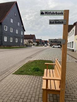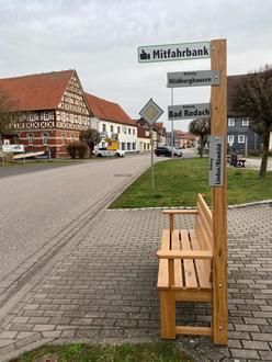 Die Mitfahrbänke funktionieren folgendermaßen: An der Seite sind an einem Pfahl Schilder mit den Namen der Ortschaften angebracht, in die man reisen möchte. Diese lassen sich ganz einfach herausklappen, so dass der vorbeifahrende Autofahrer erkennt, aha … die Person auf der Bank möchte z. B. nach Bad Rodach. Dann kann der Fahrer anhalten und die Person mitnehmen. Momentan arbeiten wir daran, auch in Bad Rodach ein oder zwei Bänke zu installieren, um die Rückfahrt abzusichern.