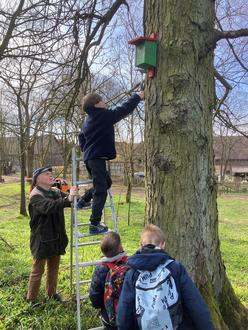 Das Holz hat freundlicherweise die Fa. Holzbau Thomae (Bedheim) gespendet. Unter fachkundiger Anleitung von Revierförster Th. Heim suchten die Kinder passende Bäume zur Anbringung und halfen auch tatkräftig mit.