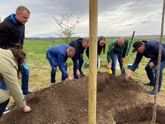 Die Mitarbeiter des Bauhofes hatten das Pflanzloch bereits vorbereitet und den Baum aus Kloster Veßra abgeholt. Gesetzt wurde dieses Mal eine „Große Schwarze Knorpelkirsche“. Ihre Früchte sind groß, rund und rotbraun bis schwarz. Sie besitzen ein rotbraunes, sehr festes Fruchtfleisch, sehr süß, sehr saftig und wohlschmeckend. Der Fruchtsaft hat eine intensive Farbe, die Steine sind klein.