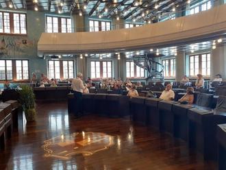 Stadtrat Willi Dürrnagel führte im Beisein von Stadtrat Manfred Dürr durch das historische Rathaus und erläuterte die umfangreichen Wandgemälde im Ratssaal.