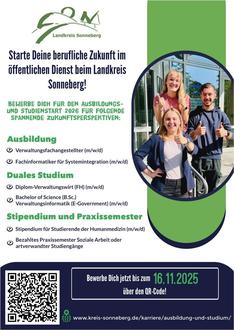 Alle Informationen zu den Ausbildungs- und Studienmöglichkeiten des Landkreises Sonneberg finden Interessierte unter https://www.kreis-sonneberg.de/karriere/ausbildung-und-studium/