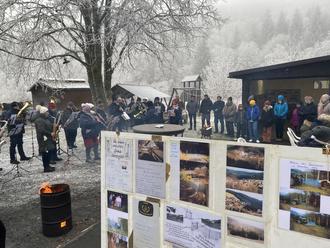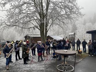 Die aktuellen Äquivalente aus Politik, Musik und Kirche versammelten sich nun auch 35 Jahre später bei eisigen Temperaturen am Schauberger Feuerwehrhaus. Während die Glühwein- und Teekocher des Schauberger Frauentreffs köchelten und die Fahnenabordnung der Freiwilligen Feuerwehr Schauberg tapfer Spalier stand, stieg man musikalisch in die ökumenische Andacht ein. Sowohl der Schauberger Musikverein als auch der Judenbacher Männerchor gaben ihr Können zum Besten - zwei Traditionsvereine, die nach wie vor Bestand haben. Pfarrerin Stefanie Brudereck (Ludwigsstadt) und Pastoralreferent Josef Grünbeck feierten zusammen mit den Anwesenden eine Andacht. Hierbei stand neben dem historischen Jubiläum „Nachbarn treffen sich wieder“ auch der Rückblick auf das abgelaufene Jahr 2024 im Fokus. Unter den Gästen waren auch die beiden Altbürgermeister Alfred Schaden (Tettau) und Albrecht Morgenroth (Judenbach) zu finden, welche nach der Wende maßgeblichen Anteil am Aufbau von freundschaftlichen Beziehungen zwischen den beiden Gemeinden hatten.