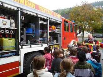 Am 10. Oktober konnten die Schüler der Grundschule Tettau mit eigenen Augen sehen, was die Feuerwehr in ihrem Ort leistet. Der Stellvertretende Kommandant Peter Borchardt begrüßte die Kinder und hatte sich zusammen mit Benjamin Baier und Carsten Sagelsdorff Zeit genommen, um die Aufgaben der Feuerwehr und deren Ausrüstung vorzustellen. Ein Höhepunkt war der Rundgang in der Fahrzeughalle, bei dem die Schüler einen Blick hinter die Kulissen werfen konnten. Natürlich wurden die Fahrzeuge ausführlich vorgestellt und erklärt. Jedes Kind durfte sogar einmal in einem Löschfahrzeug Platz nehmen.