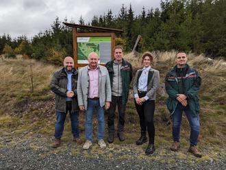 v.l.: Dr. Jonas Geissler (Mitglied des Deutschen Bundestages), Peter Ebertsch (1. Bürgermeister Markt Tettau), Martin Körlin (Förster i.R.), Lea Steinberger (Försterin AELF Coburg-Kulmbach), Jens Haertel (Bereichsleiter Forsten AELF Coburg-Kulmbach).