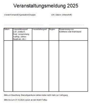 | Datum | Veranstaltungsart (z.B. Jubiläum, Fest, Versammlung, Ausflug, Jahreshauptversammlung etc. | Veranstaltungsort | Beginn | Reservierung von Kühltheke oder Marktstand |