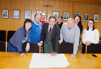 Carletta Heinz, Rainer Mattern, Moritz Bauer (Pressesprecher Heinz-Glas), Dekan Dr. Markus Müller, Sandra Ziegler, Bürgermeister Peter Ebertsch, Michaela Schneider und Theresa Zipfel freuen sich auf den neuen Betriebskindergarten (Bild:Heike Schülein).