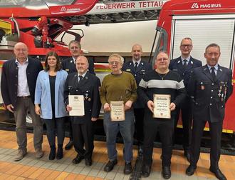 Neben der staatlichen Ehrung standen auch Vereinsehrungen und Beförderungen an. Der Feuerwehr Tettau hält seit 25 Jahren Dominik Eschrich die Treue. Seit 40 Jahren gehören Heintje Wicklein, Reinhold König, Max Stauch und Oliver Stauch dem Verein an.