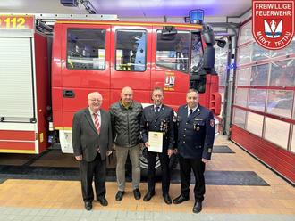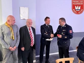 Eine besondere Ehrung stand für unseren Vorsitzenden Norbert Brökelschen an. Er bekam das staatliche Ehrenabzeichen in Gold für 40 Jahre aktiven Feuerwehrdienst aus den Händen von dem weiteren Stellvertreter des Landrates Bernd Steger sowie Kreisbrandrat Frank Fischer. In einer umfangreichen Laudatio konnte auf seine Feuerwehrkarriere zurückgeblickt werden.