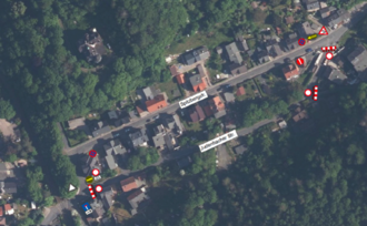 Luftbild der Sperrstrecke in Hüttensteinach: Von Judenbach aus ist Sonneberg über die Spitzbergstraße weiter erreichbar. In Richtung Judenbach hingegen wird der Straßenverkehr über Jagdshof umgeleitet.