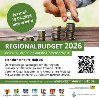 Bis zum 10. April 2026 können Förderanträge für Kleinprojekte im Rahmen des Regionalbudgets bei der ILE Thüringisch-Fränkische Rennsteigregion eingereicht werden. Weitere Infos rund um das Regionalbudget und die Antragsunterlagen finden Sie unter www.vgem-teuschnitz.de.