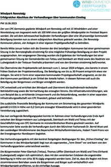 Das Verhandlungsergebnis mit den konkret festgelegten Bedingungen für den „frühen Einstieg“ der Kommunen in das Windparkprojekt liegt nun als sogenanntes „Term Sheet“ vor und kann von den Verhandlungsparteien unterzeichnet werden.