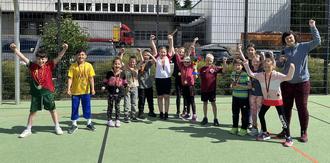 Die Kinder starteten vor den Wettkämpfen mit einer gemeinsamen Erwärmung, um Verletzungen vorzubeugen. An den verschiedenen Stationen wurden sie von engagierten Helfern unterstützt, darunter auch der ehemalige Schulleiter Dietmar Schmidt, der beim Weitwurf half. Teamgeist zeigten die Schülerinnen und Schüler in der anschließenden Mannschaftsstaffel, bei der Greta, Mark, Peshmarga und Lucy eine Goldmedaille gewannen.