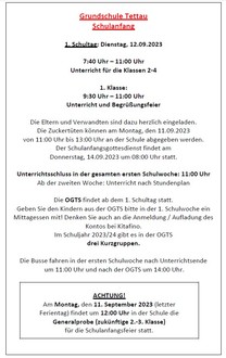| ACHTUNG! Am Montag, den 11. September 2023 (letzter Ferientag) findet um 12:00 Uhr in der Schule die Generalprobe (zukünftige 2.-3. Klasse) für die Schulanfangsfeier statt. |