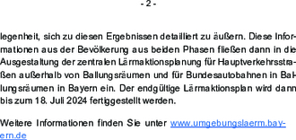 In einer zweiten Phase, die voraussichtlich Ende 2023 beginnt, werden die Bürgerinnen und Bürger dann nochmals beteiligt. Sie bekommen Gelegenheit, sich zu diesen Ergebnissen detailliert zu äußern. Diese Informationen aus der Bevölkerung aus beiden Phasen fließen dann in die Ausgestaltung der zentralen Lärmaktionsplanung für Hauptverkehrsstraßen außerhalb von Ballungsräumen und für Bundesautobahnen in Ballungsräumen in Bayern ein. Der endgültige Lärmaktionsplan wird dann bis zum 18. Juli 2024 fertiggestellt werden.