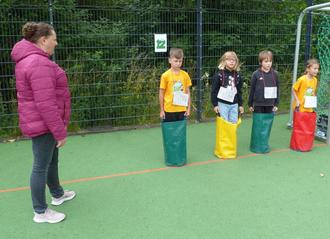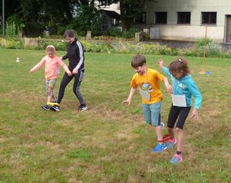 Der Tag stand ganz im Zeichen der Freude an der Bewegung und des Teamgeists. In bunten Gruppen, bei denen die Großen mit den Kleinen zusammen unterwegs waren, konnten die Kinder an verschiedenen Stationen ihre Fähigkeiten testen. Beim Eierlauf, Sackhüpfen, Dosenwerfen, Rollbrettfahren und einem Puzzlelauf waren alle mit Begeisterung dabei. Manchmal hatten die Älteren einen kleinen Vorteil, zum Beispiel beim Basketball, manchmal waren die Kleinen unschlagbar - etwa beim Bobbycar-Rennen.