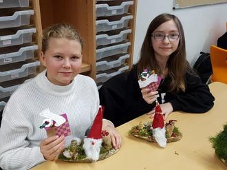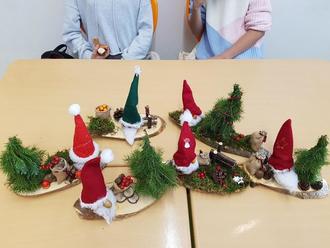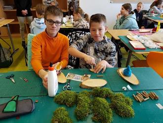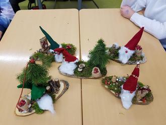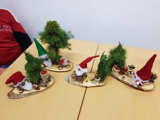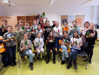 Welche Herausforderung es mit sich bringt, aus Stöcken, Grünzeug und Draht einen funktionalen und möglichst auch noch lebensecht wirkenden Baum zu fabrizieren, der dann auch noch fest auf dem Untergrundbrett verankert steht, wurde so manchem Kind im Versuch-Irrtum-Prozess mehr als bewusst. Um so größer war die Freude, wenn endlich alles passte und auch noch hielt. Ob kleine Wagen, vollgeladen mit winzigen Baumstämmen, Holzscheithalter im Miniaturformat oder gar ein Hirsch, dem eigenen Schöpfertum konnte umfänglich freier Lauf gelassen werden. Besondere Liebe zum Detail ließen die Kinder bei ihren Wichteln walten. Das Gesamtresultat konnte sich mehr als sehen lassen: Jedes der kleinen Miniaturbrettchen erwies sich als Augenweide und der Stolz auf das Erreichte war mehr als verdient. Ob als weihnachtliches Geschenk oder zur Selbstfreude aufgestellt, der Projekttag wurde einstimmig als voller Erfolg gewertet und zauberte ein Lächeln auf das Gesicht der liebenswerten Frau Fröh.