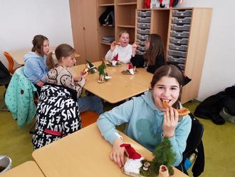 Lecker, Laugenbrezel! Hinten am Tisch von links im Uhrzeigersinn: Mathilda Schetelich, Natalie Müller, Maila Schramm, Isabell Klupp; vorn: Vroni Schellenberg