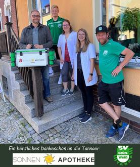 Wir möchten uns ganz herzlich für die langjährige Unterstützung durch Jens und Uta Eisentraut mit ihrem Team der Sonnen-Apotheke in Tanna bedanken. Neben der Tannaer betreiben die beiden auch die Löwen-Apotheke in Hirschberg und damit zwei für alle Einwohner wichtige Einrichtungen. Seit langem statten sie unsere Mannschaften mit dem zum Glück nicht oft, aber doch immer mal wieder nötigen medizinischen Ersthilfe-Material wie Pflaster, Binden und Kühlmanschetten aus. In diesem Jahr gab es oben drauf einen neuen, voll ausgestatteten Ersthilfe-Koffer. Natürlich gilt wie bei jeder Versicherung - der beste Ersthilfe-Koffer ist der, den man zur Sicherheit hat, aber dann doch nicht braucht. In diesem Sinne wünschen wir unseren Vereinsmitgliedern ein mögliches verletzungsfreies sportliches Hobby!
