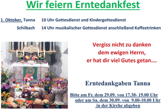 | Tanna | 10.00 Uhr | mit Kindergottesdienst Kirchweih |