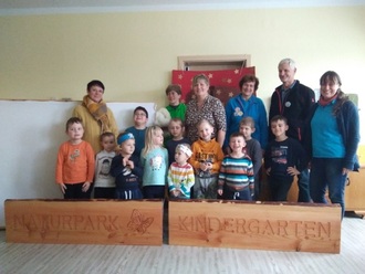 Im Dezember öffnete sich unser lebendiger Adventskalender und heraus kamen Frau Mewes, Frau Wehenkel und Frau Kober, drei Mitarbeiter des Naturpark Thüringer Schiefergebirge Obere Saale. Feierlich bekamen wir vom Naturpark das holzgeschnitzte Schild übergeben, das von nun an unseren Kindergarten als Naturpark- Kindergarten auszeichnet.