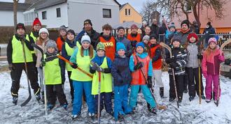 Nach einer langen Durststrecke konnten wir dieses Jahr endlich mal wieder unseren Dorfteich als Eishockeyfläche nutzen. Da spontane Sachen immer am besten sind, wurde früh 10.00 Uhr die Idee eines Turniers geboren und verbreitet. Der Zuspruch zum Beginn um 14.00 Uhr war riesig. Wir konnten knapp 50 Begeisterte begrüßen, von denen sich 20 Leute aus allen Altersklassen sportlich betätigen wollten. Somit konnten wir 3 gemischte Mannschaften (ganz jung, jung, erwachsen) bilden mit je 6 Mann und ein Turnier mit Hin- und Rückrunde spielen. Gewonnen haben natürlich alle. Ganz viele brachten auf Anfrage ihre Restbestände Glühwein von Weihnachten mit und vieles mehr. Somit gab es für alle ausreichend Glühwein, Kinderpunsch und Kuchen. Großen Dank an alle Organisatoren und vor allem an alle spontanen Besucher. Es war ein sehr schöner und gelungener Sonntagnachmittag.
