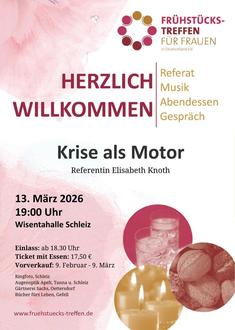 Christliche Frauen aus der Region laden wieder herzlich zum Frühstückstreffen für Frauen am Abend ein. Neugierige und aufgeschlossene Frauen sind willkommen, einen besonderen Abend zu erleben - geprägt von Gemeinschaft, Wertschätzung und lebensnahen Impulsen.