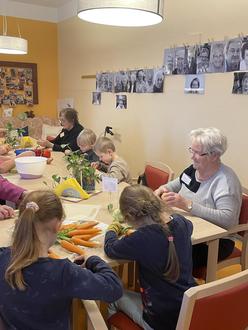"Nicht irgendwas, sondern gesund und bunt sollte das Mittagessen sein. Es gab Mangold-Curry und Buchstabensuppe mit viel Gemüse, dazu als Dessert Jogurt mit Obstsalat und Nüssen sowie Käsekuchen-Muffins mit frischen Beeren. Es wurde Gemüse geschnippelt, Obst gewaschen, Eier aufgeschlagen, Teig gerührt, viel geredet und gelacht", blickt Tagespflege-Leiterin Jennifer Schwiersch zurück.