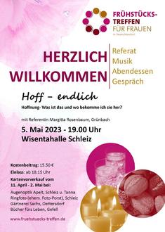 Zu einem Frauenfrühstückstreffen am Abend mit dem Thema „Hoffnung“ laden wir Mitarbeiterinnen des Vorbereitungskreises in Schleiz und Umgebung in die Wisentahalle Schleiz ein.