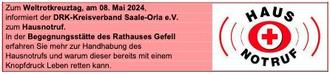| Seniorennachmittag - Im Alter sicher im eigenen Zuhause, der DRK-Kreisverband Saale-Orla e.V. informiert am Weltrotkreuztag zum Thema Hausnotruf, Begegnungsstätte im Rathaus Gefell (Info und Anmeldung: Diana Oertel, Mobil: 0151 14608677) |