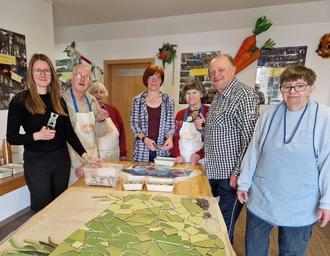 Die Senioren der Tagesstruktur Stelzen probieren zusammen mit Elisabeth Kühnast aus Tanna etwas Neues aus. Die Mosaiklegerin und Künstlerin bietet pädagogische sowie kreative Kurse für Interessierte oder Bildungseinrichtungen. „Wir haben von ihrem Angebot im Tanner Amtsblatt gelesen und die Künstlerin für uns entdeckt. Derzeit begleitet sie ein Projekt, das allen viel Freude bereitet. Gemeinsam mit den Klienten gestaltet sie aus gebrochenen Fliesen Bilder, die sie im Vorfeld aufgezeichnet hat“, erklärt Heike Baumann, Mitarbeiterin der Tagesstruktur für alt gewordene Menschen mit Behinderung in Stelzen. Die Einrichtung gehört zur Diakoniestiftung Weimar Bad Lobenstein.