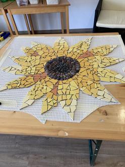 Es entstehen Bilder von Blumen, Gräsern, Wiesen und einem Schmetterling. Die einzelnen Objekte werden später an einer Wand der Besonderen Wohnform zu einem Gesamtbild zusammengestellt, aufgeklebt und verfugt. „Wir haben so viel Spaß und vergessen dabei regelmäßig die Zeit und manchmal fast das Mittagessen“, sagt Heike Baumann.