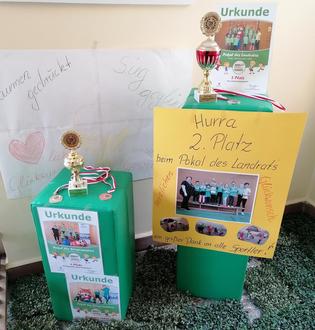 Mit diesem Sieg waren wir damit für das Finale um den “Pokal des Landrates“ am 18. April in Bad Lobenstein qualifiziert. Nach der sportlichen Erwärmung mit dem lustigen „Muskel-Kater“ ging es an den Start. Wieder mussten verschiedene Stationen durchlaufen werden und der Ehrgeiz und die Anstrengungen der Mannschaft waren unglaublich. Ein Kind hatte sogar die perfekte Idee der „Fußbremse“, um die Übergabe des Staffelstabes mit Ring noch besser und schneller hinzukriegen. So erkämpften sich die Kinder den hervorragenden 2. Platz (von 11 teilnehmenden Mannschaften) mit dem heiß ersehnten „Pokal des Landrates“.
