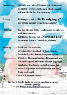 Vom 19. bis 22. Juni 2025 lädt das thüringische Zollgrün zu einer großen Jubiläumsfeier ein: 675 Jahre Geschichte, Tradition und Gemeinschaft werden auf dem Festgelände im Ortsteil von Tanna gefeiert.