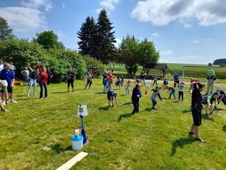 Im Rahmen unseres Projektes „Bewegung“ veranstalteten wir am vergangenen Freitag ein Sportfest. Die Eltern kamen zu uns und gemeinsam schwitzten wir um die Wette. Das Sportfest begann mit einer gemeinsamen Erwärmung, in der wir Zumba tanzten und andere Bewegungslieder. Anschließend bekamen die Familien ihre Stempelkarten und konnten an die Sportstationen der Erzieher gehen. Die Familien zeigten ihr Können, zum Beispiel beim Dosenwerfen, beim Tauziehen und beim Stiefelweitwurf. Wenn die Familien die Stationen absolviert hatten, bekamen sie einen Stempel auf ihre Karte. Zum Schluss erhielten alle Kinder eine Medaille und die Familien eine Urkunde. Für das leibliche Wohl wurde natürlich auch gesorgt. Die Familien konnten sich Wiener und Brötchen schmecken lassen. Das war ein toller Tag. Nun sind alle Kinder und Familien fit für den Sommer.