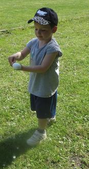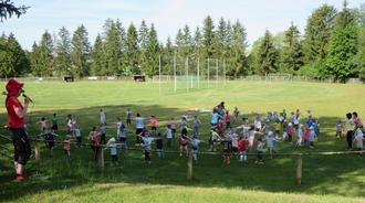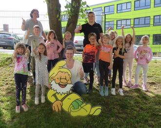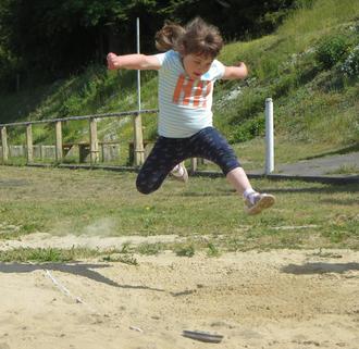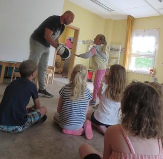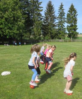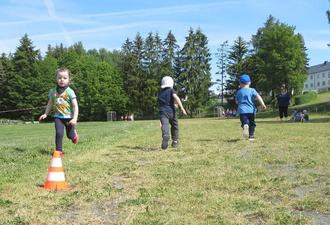 Die „älteren Zwerge“ machten sich auf den Weg ins Stadion, wo sie der Frühsportclown schon erwartete. Bei lustiger Musik machte die Erwärmung besonders viel Spaß. Im Kindergarten erhielt jedes Kind zuvor einen farbigen Punkt aufs T-Shirt geklebt und auch jede Erzieherin wurde farbig markiert. In Windeseile bildeten sich so 9 Sportgruppen und der Stationsbetrieb begann. Egal ob beim Wettlauf, Weitsprung, Eierlauf, Sackhüpfen, Tauziehen, Hüpfen, Schwungtuch oder Torwandschießen - jedes Kind gab sein Bestes und war mit Spaß bei der Sache. Ein lauter Pfiff signalisierte immer den Stationswechsel, sodass alles ausprobiert werde konnte.