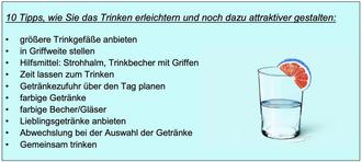 Umso wichtiger ist es, auf sich und andere zu achten. Eine zeitweise Unterstützung bei haushaltsnahen Tätigkeiten zur Einschränkung anstrengender Aktivitäten und gesundes Essen, z.B. leichte, salzige Speisen sowie viel wasserreiches Obst und Gemüse, sind hierbei von Vorteil. Auch sollten Sie auf eine ausreichende Flüssigkeitszufuhr achten - die Erinnerung ans regelmäßige Trinken kann hierbei helfen. Insbesondere bei der Pflege älterer oder kranker Menschen sollte darauf ein besonderes Augenmerk gelegt werden. Nachfolgend erhalten Sie eine Reihe von Tipps zur Trinkmotivation.