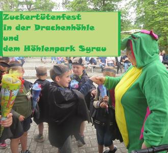 Ein Highlight der „Eichhörnchenzeit“ war das Zuckertütenfest, das am 27. Juni stattfand. Nachdem die Kinder die Zwiebel des Zuckertütenbaumes gesteckt, gepflegt und gehegt hatten, konnten wir beobachten, wie die Zuckertüten wuchsen. Am Tag des Festes sollte geerntet werden, doch oh Schreck, der Baum war leer. Unser Gruppenmaskottchen „Felix“ - eine Fledermaus, hatte aber einen Brief hinterlassen. Darin stand, dass er die Tüten mitgenommen hatte, um sie seinem Freund „Justus“ - dem Drachen zu zeigen. Was nun? Zuerst stärkten wir uns am leckeren Frühstücksbuffet, danach bastelten wir tolle Fledermauskostüme und nach dem Mittagessen machten wir uns auf den Weg. Mit Kleinbussen fuhren wir nach Mehlteuer (Danke an den SV Grün --Weiß Tanna für die Bereitstellung des Busses) und wanderten mit „Felix“ nach Syrau zur Drachenhöhle, denn dort sollten unsere Tüten bewacht werden. Nach einer tollen Führung durch die Höhle mit Lasershow, trafen wir am Ausgang endlich auf „Justus“. Sogar die Eltern waren gekommen und konnten hautnah miterleben, wie der Drache dann persönlich die Zuckertüten an die stolzen und glücklichen Kinder überreichte. Nach dem gemeinsamen Abendessen, zu dem alle beigetragen hatten, klang dieser aufregende und hoffentlich unvergessene Tag im Höhlenpark Syrau aus.