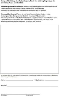 Ihre Daten sind möglicherweise auch bei anderen öffentlichen Stellen wie z. B. dem Finanzamt, dem Jugendamt und bei Gerichten gespeichert, die von Dritten ausgeforscht werden können. Sie haben gegebenenfalls die Möglichkeit, die Sperrung von Daten in anderen öffentlichen Registern wie z. B. dem Ausländerzentralregister oder dem zentralen Fahrzeugregister zu veranlassen.