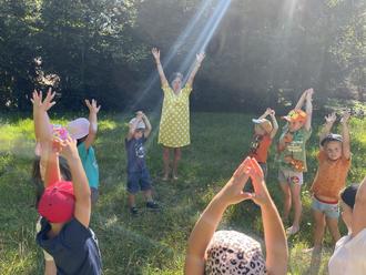 Aufgrund der sommerlichen Temperaturen nutzten wir die Wasserbecken für Arm-und Beinbäder, liefen über Steine und Mulch und turnten auf der Wiese verschiedene Yoga Übungen.