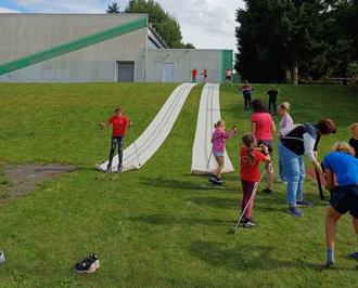 Die DSV-SommerSkiChallenge powered by Sparkassen-Finanzgruppe ist ein deutschlandweiter Wettbewerb, bei dem fünf verschiedene Stationen in den Bereichen Koordination, Ausdauer, Kraft, Schnelligkeit und Geschicklichkeit in Teams zu bewältigen sind. Nach einem gemeinsamen Aufwärmen hüpften die 34 Kinder durch Koordinationsleitern und Reifen, machten Kniebeugen und liefen um die Wette. Rund zwei Stunden gaben die 7 Teams ihr Bestes, um an den fünf Stationen so viele Punkte wie möglich zu sammeln