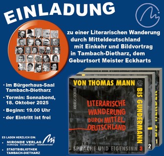 Eine besondere Empfehlung für alle Kulturinteressierte. Eine literarische Wanderung durch Mitteldeutschland. Die Lesung findet in Tambach-Dietharz, dem Geburtsort Meister Eckharts, und wird durch einen Bildvortrag bereichert - ein Abend, der Literatur und Geschichte lebendig werden lässt.