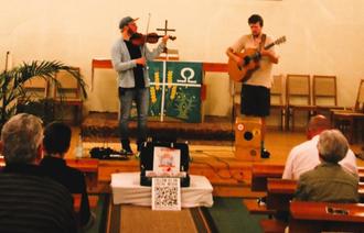 Nach einer Pause mit einem kleinen Imbiss an der Dorftafel wurde gegen 19.00 Uhr das zweite Konzert des Abends angekündigt. Das Duo Crepes Sucette, das sind zwei außergewöhnliche Musiker, Eric Seehof (Gitarre/Cajon) und Lukas Bergmann-Gabel (Violine) begeisterten mit toller Folkmusik.